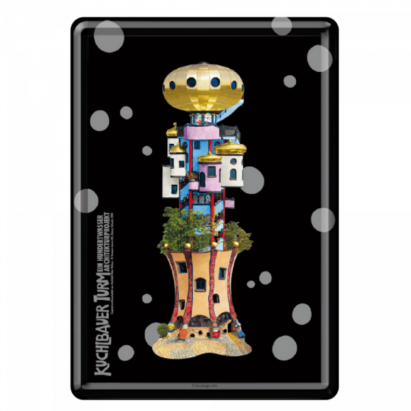 Das dekorative Blechschild zeigt das traditionsreiche Motiv „Hundertwasser Turm“ der Brauerei Kuchlbauer. Mit seinen kompakten Maßen von 100 x 145 mm eignet es sich ideal als Sammlerstück, Geschenk oder originelle Dekoration für Küche, Bar oder Bierstube.